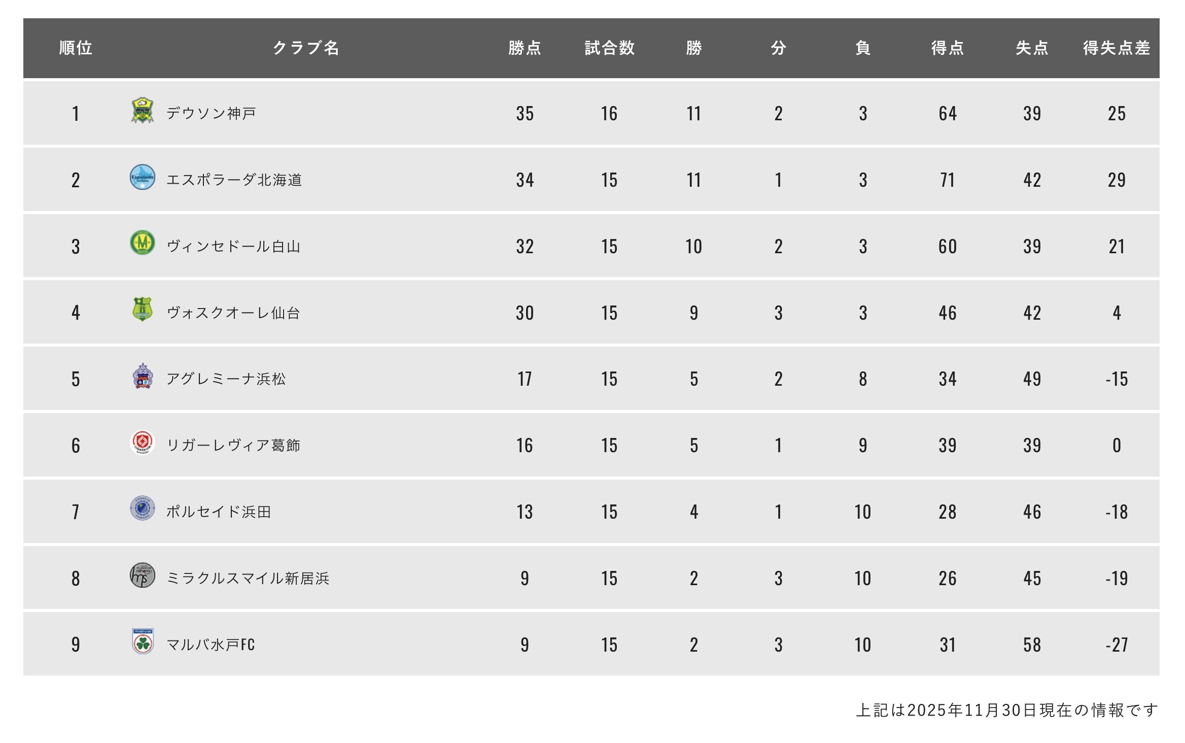 | 11/16 | ヴォスクオーレ仙台 | 2-2 | デウソン神戸 | 14:00 | 本山製作所青葉アリーナ |