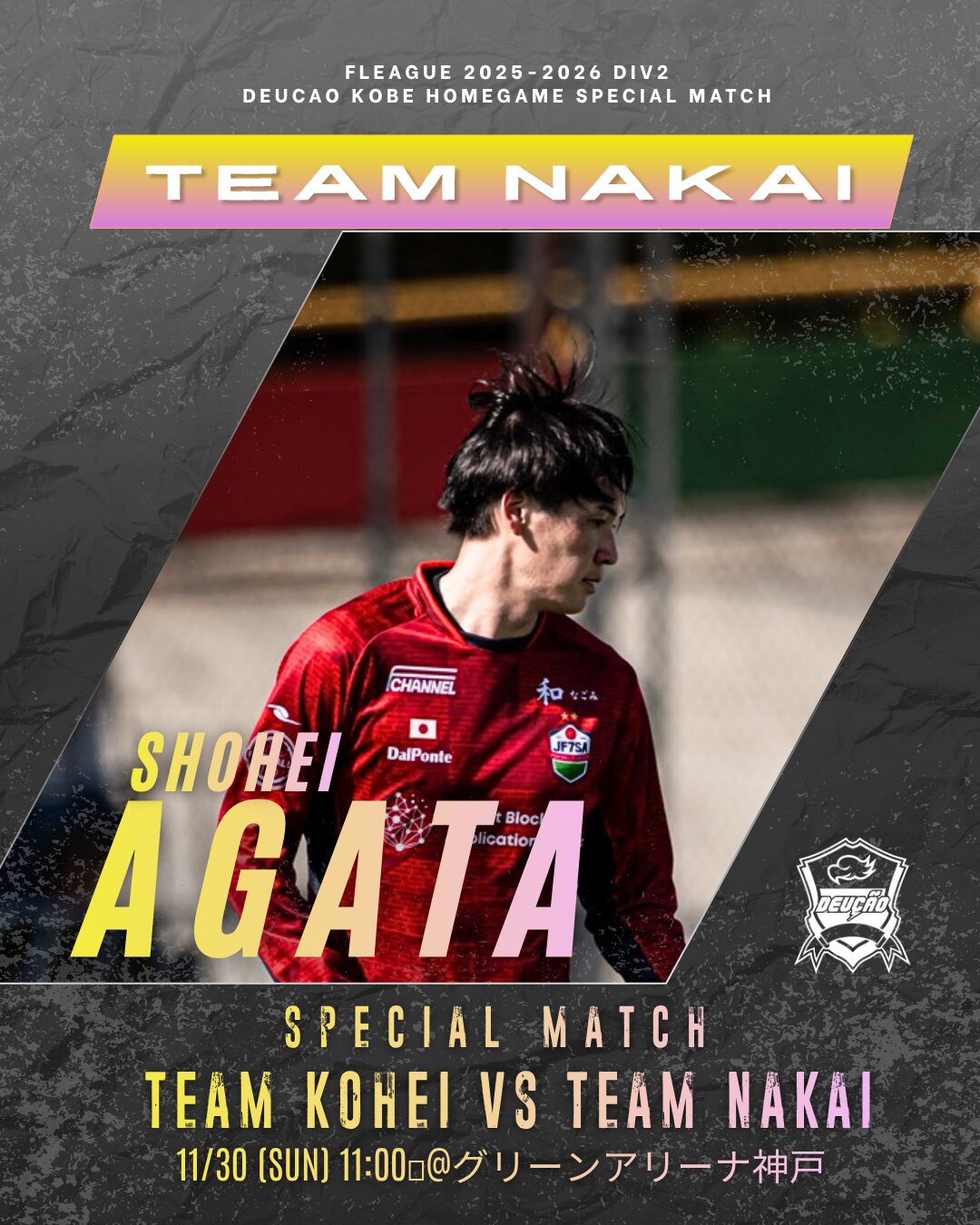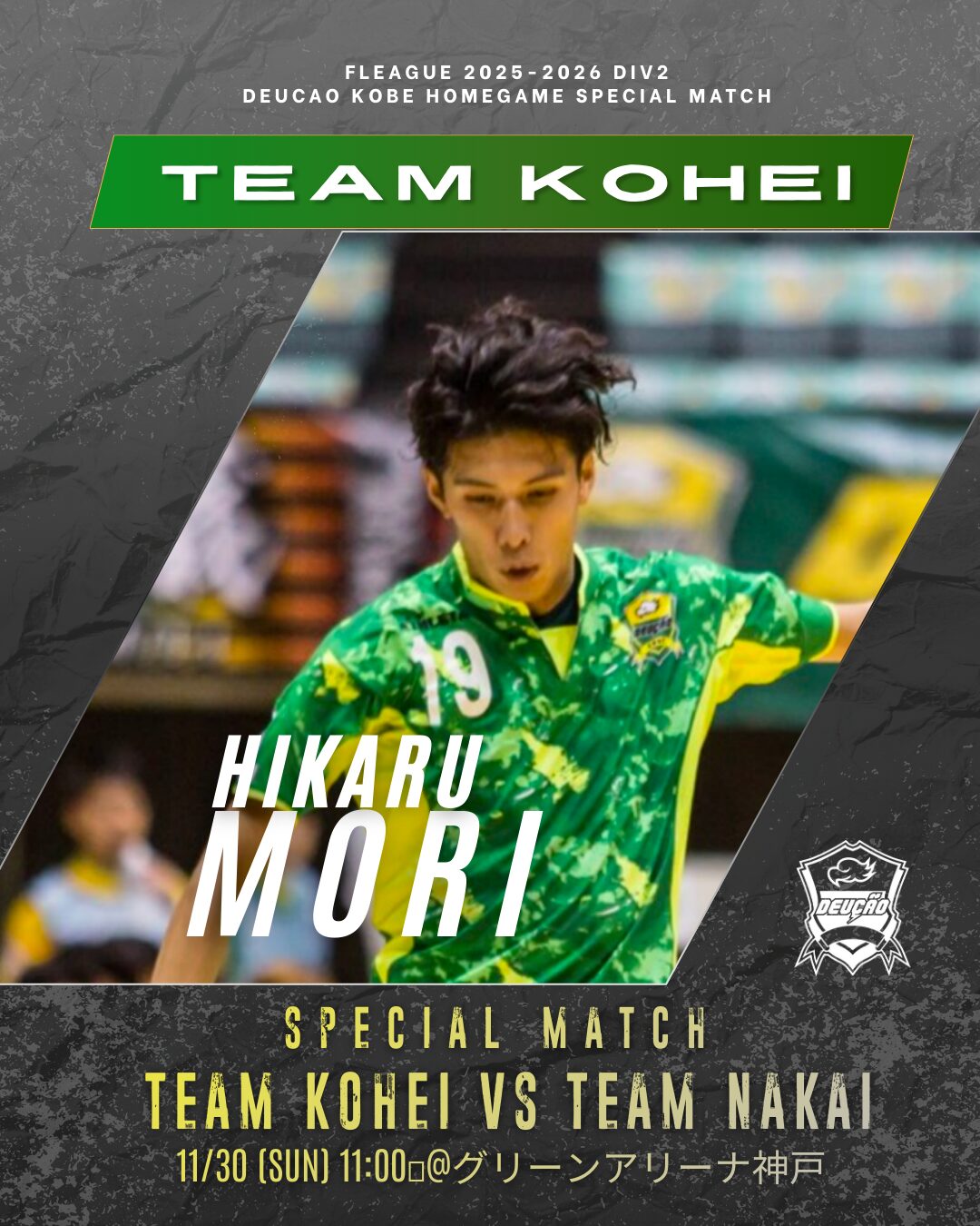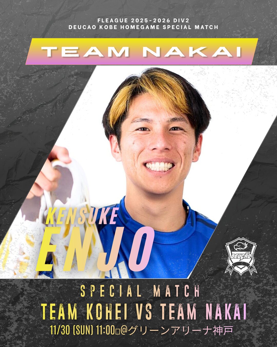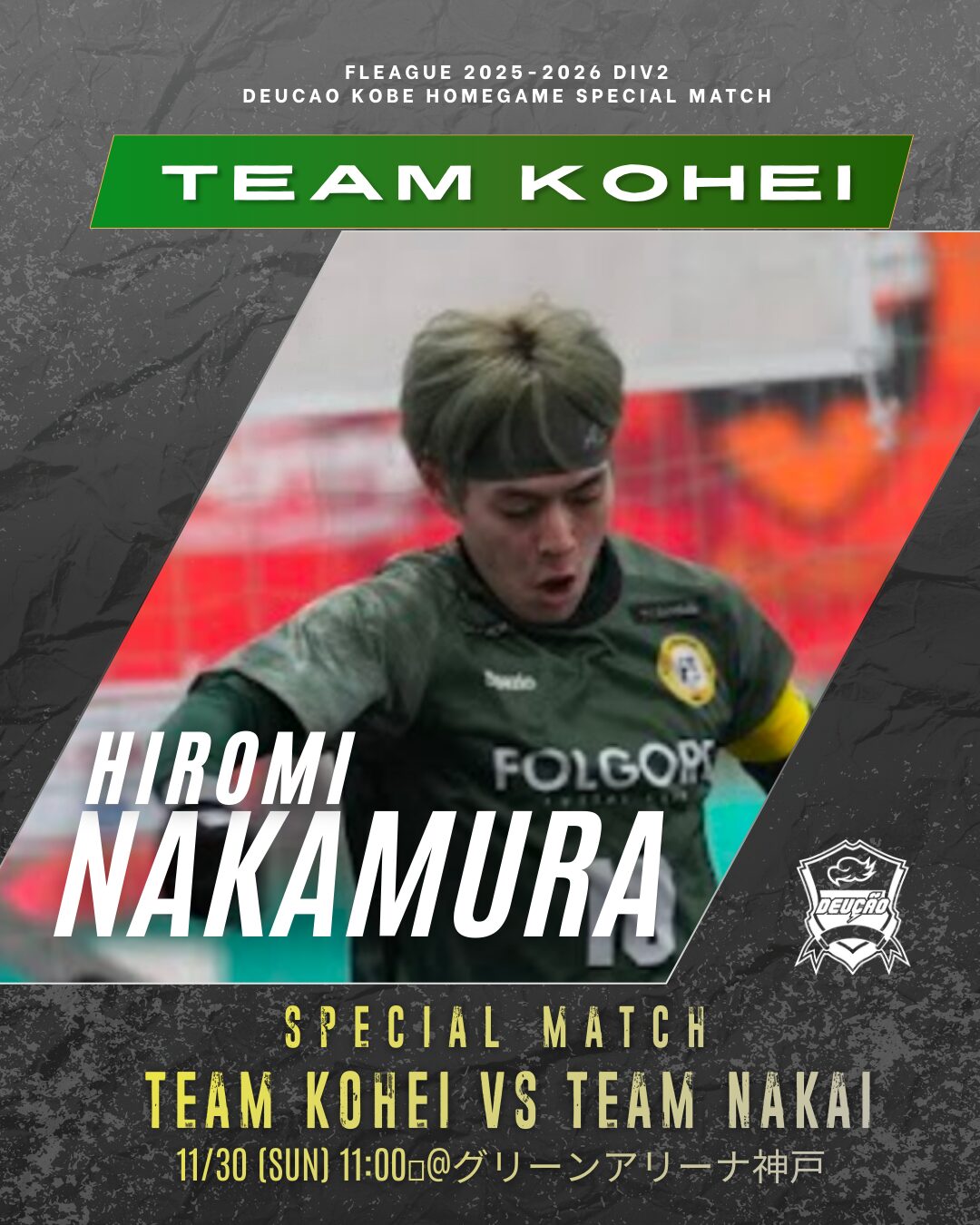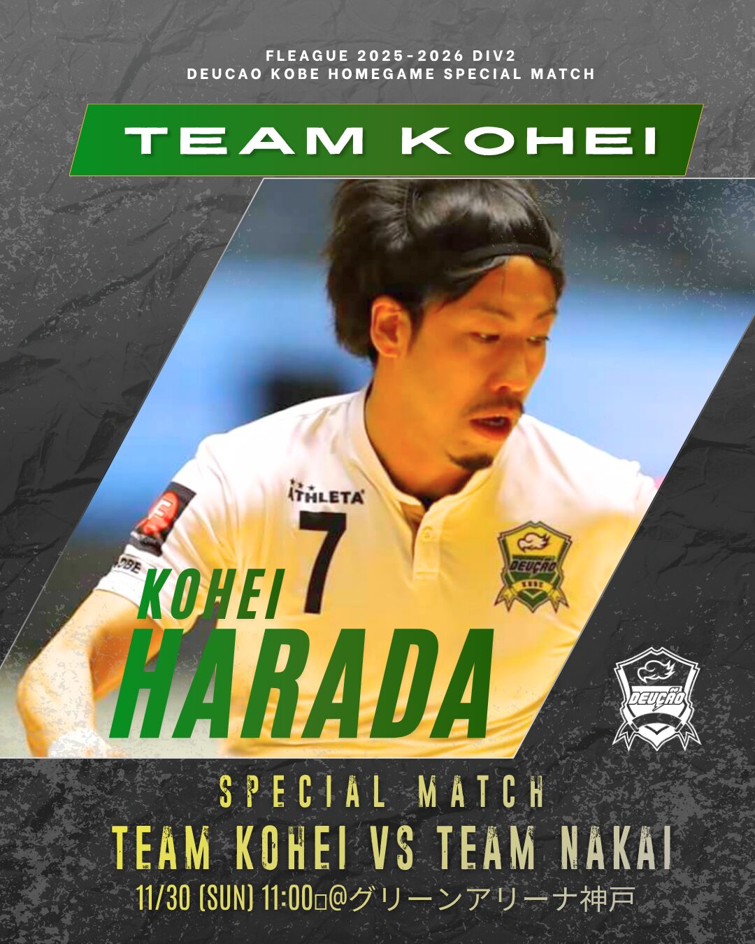 11月30日(日)デウソン神戸のメットライフ生命Fリーグ2025-26Div2「デウソン神戸vsエスポラーダ北海道」の試合前イベントとして、 スペシャルマッチ「チーム原田浩平×チーム中井健介」を開催いたします。